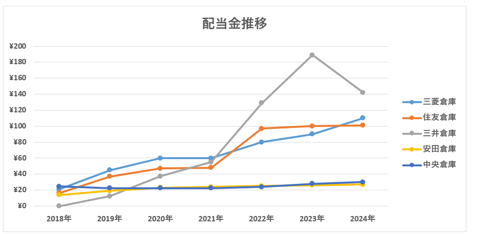 配当金推移で見ると三井倉庫が既に減配です。これ急激に上がったり下がったり景気敏感株みたいな配当推移よね、とてもディフェンシブとは言えないような配当推移です。