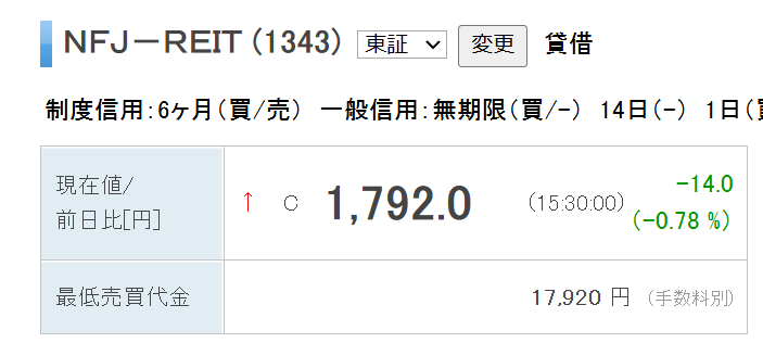 わいの購入しているJ-REIT指数連動型の1343の株価もぱっとしません